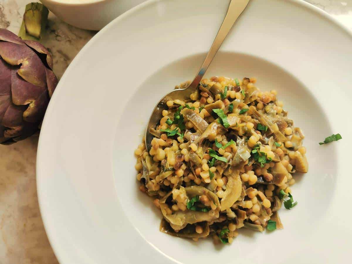 This simple pasta dish highlights tender artichokes cooked with garlic and olive oil. The result is a light, flavorful meal with a slightly tangy finish.