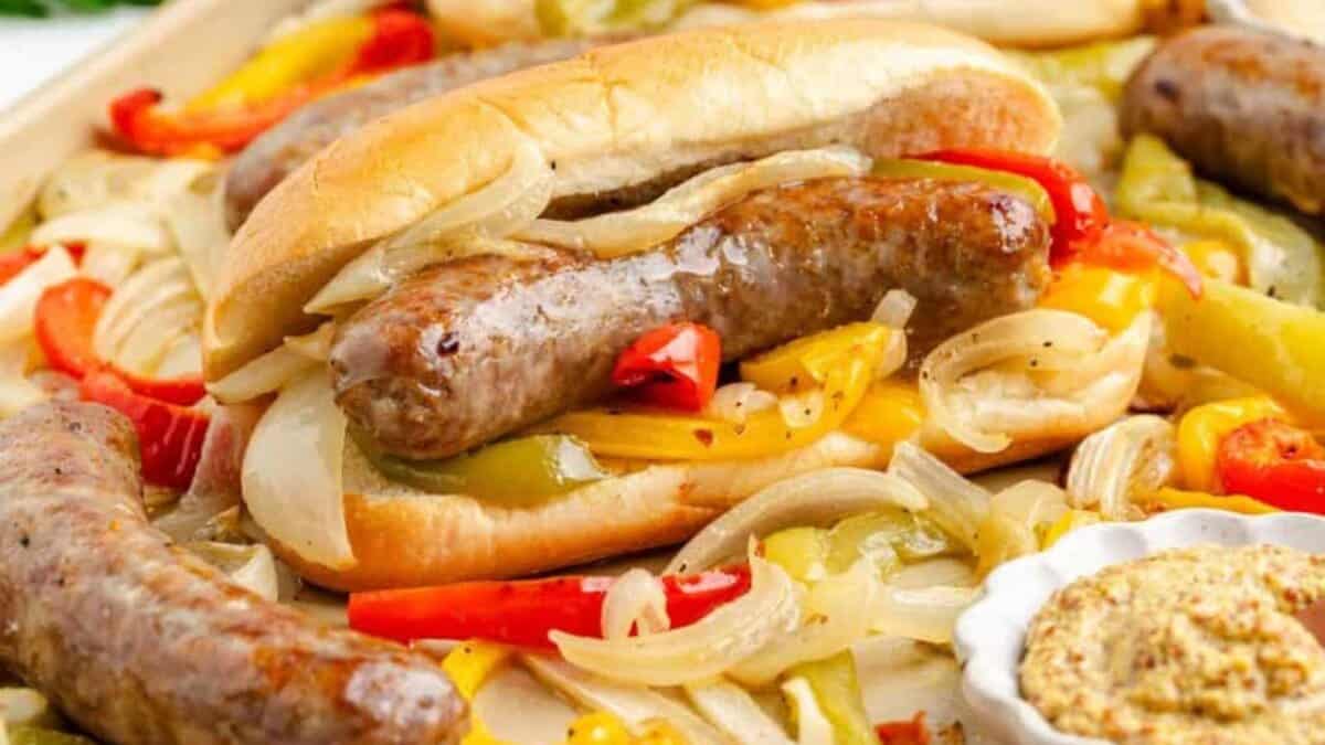 Brats and peppers roast into a hearty dinner that feels like something you’d order at a pub. It’s filling without needing sides beyond bread or mustard. One pan feeds more than one night for less than delivery.