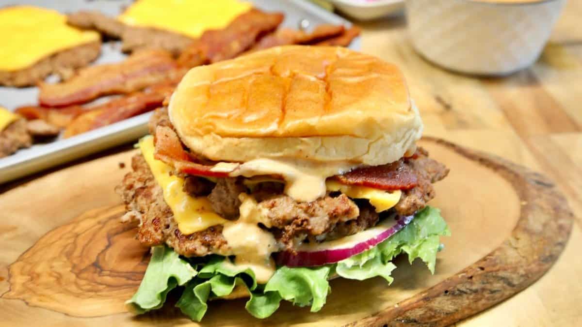 Smash burgers rely on thinner patties, which keeps costs down while still feeling filling. Bacon and cheese add heft, making this a complete dinner without sides. It’s hard to justify delivery when burgers like this are on the table.