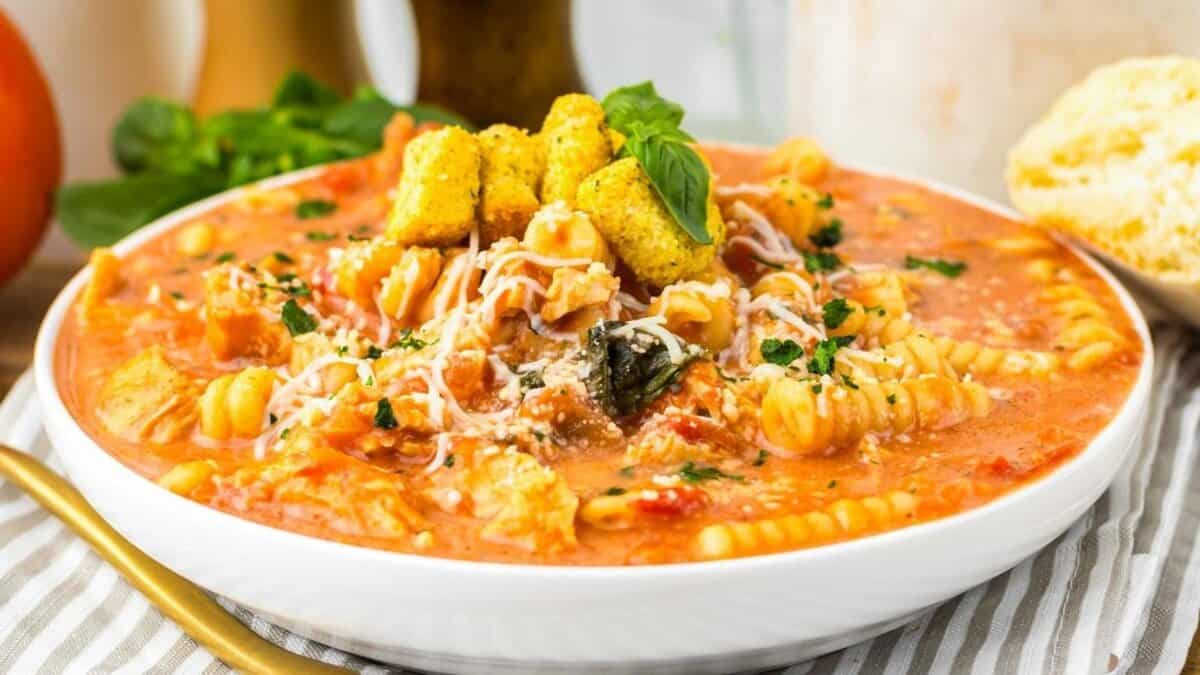 This soup takes a familiar comfort dish and turns it into something softer and easier to settle into. Chicken, pasta, and tomato broth make it feel complete. It’s a good option when you want comfort without a big plate.