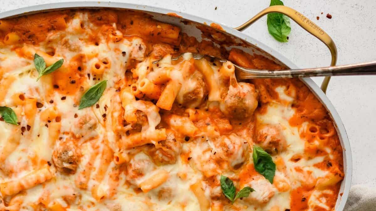 Meatballs and pasta bake in a creamy tomato sauce that thickens into a scoopable casserole. The pasta softens directly in the liquid while the cheese settles across the top. It serves cleanly and reheats well.
