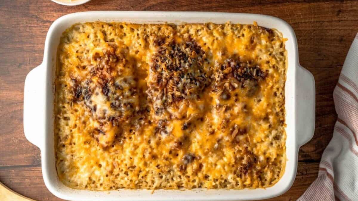 Ground beef bakes with rice and vegetables under a creamy sauce that sets into a scoopable casserole. The crunchy noodle topping adds texture across the surface while the inside stays soft and cohesive. It serves cleanly and works well for reheating.