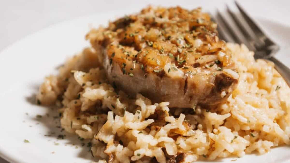Pork chops bake directly on top of seasoned rice, letting their juices soak into the grains as everything cooks together. The rice turns fluffy and rich while the pork stays tender and easy to cut. It works well as a true dump-and-bake dinner that fills the plate on its own.