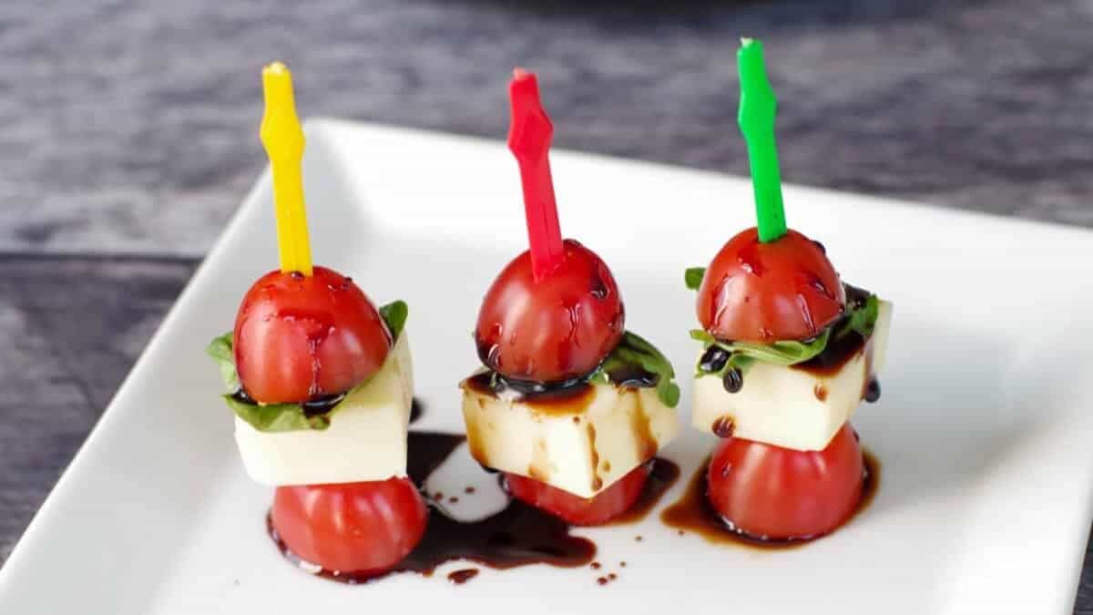 Skewers layered with cherry tomatoes, mozzarella, basil, and balsamic glaze bring all the flavor of Caprese salad in a portable form. With only four ingredients, they’re quick to make and one of the first platters to empty at summer gatherings.