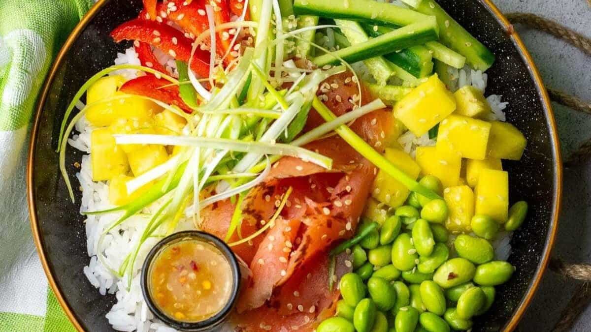 Smoked salmon, rice, mango, cucumber, and a citrusy dressing layer into a bowl that feels fresh but still holds up in the fridge. Cook the rice once and portion out the toppings for a few days of lunches. It’s quick to assemble and doesn’t require reheating.