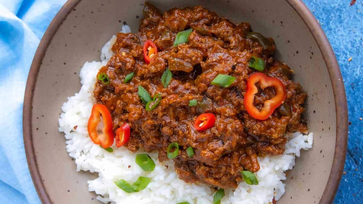 Ground beef and red peppers cook with dried chiles in one skillet, then get topped with a soft egg for extra richness. Make the beef and rice in advance and store separately for easy assembly. It reheats well and keeps lunch from feeling bland.