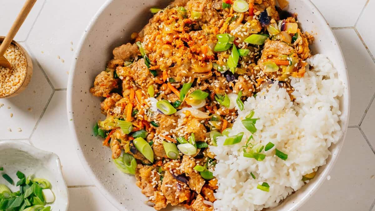 Ground beef cooks in about 10 minutes with gochujang and simple spices, then gets spooned over rice with vegetables. Make the beef and rice at the same time and divide into containers. It’s fast, bold, and built for weeknight meal prep.