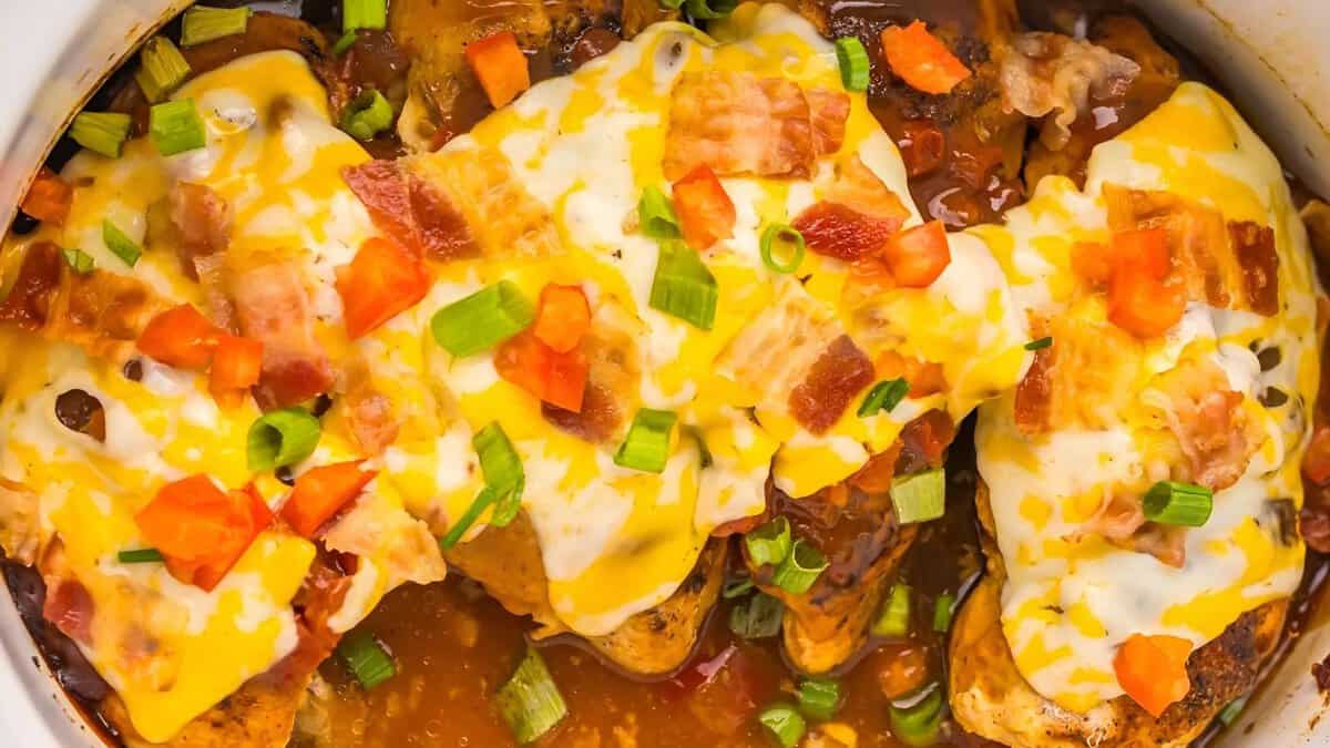 Tender chicken simmers in barbecue sauce, then finishes with melted cheese and crispy bacon. With only a few minutes of prep, the slow cooker does most of the work, leaving you with a comforting, flavorful dinner. It is a practical recipe for busy days when you still want something hearty on the table.