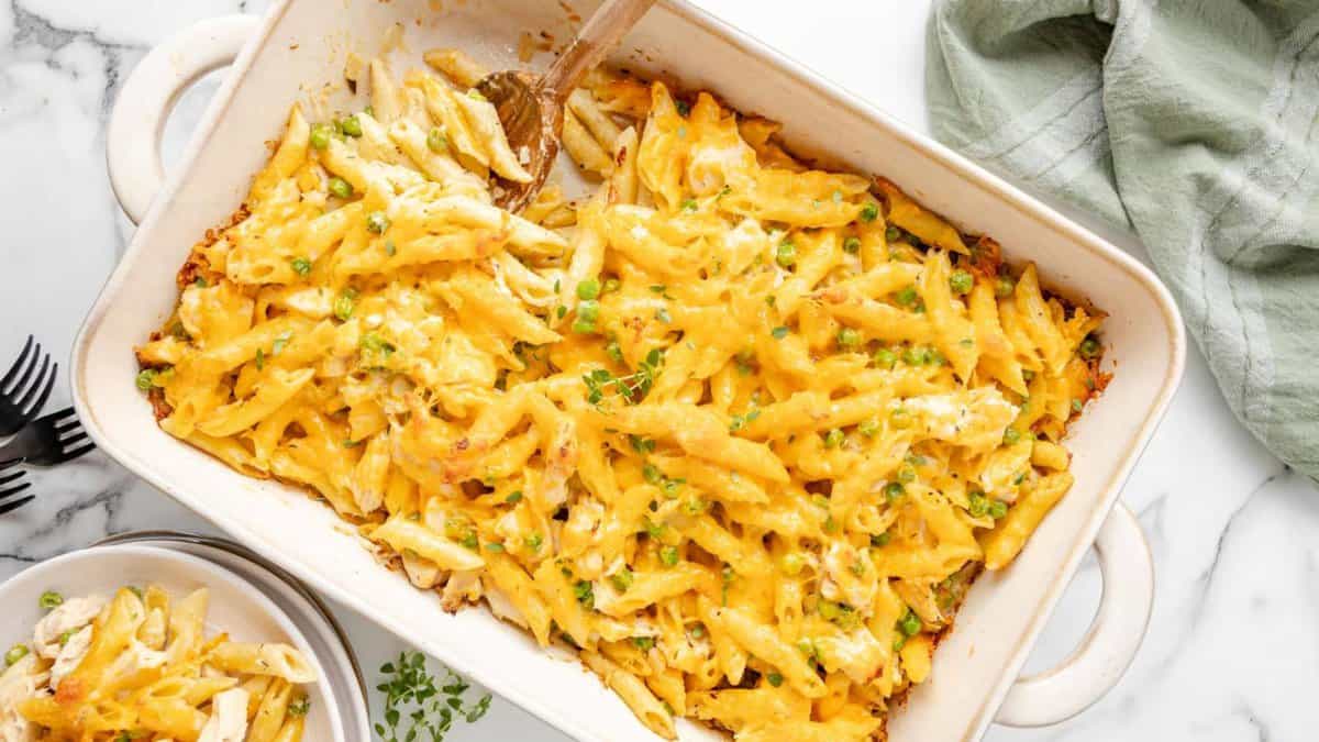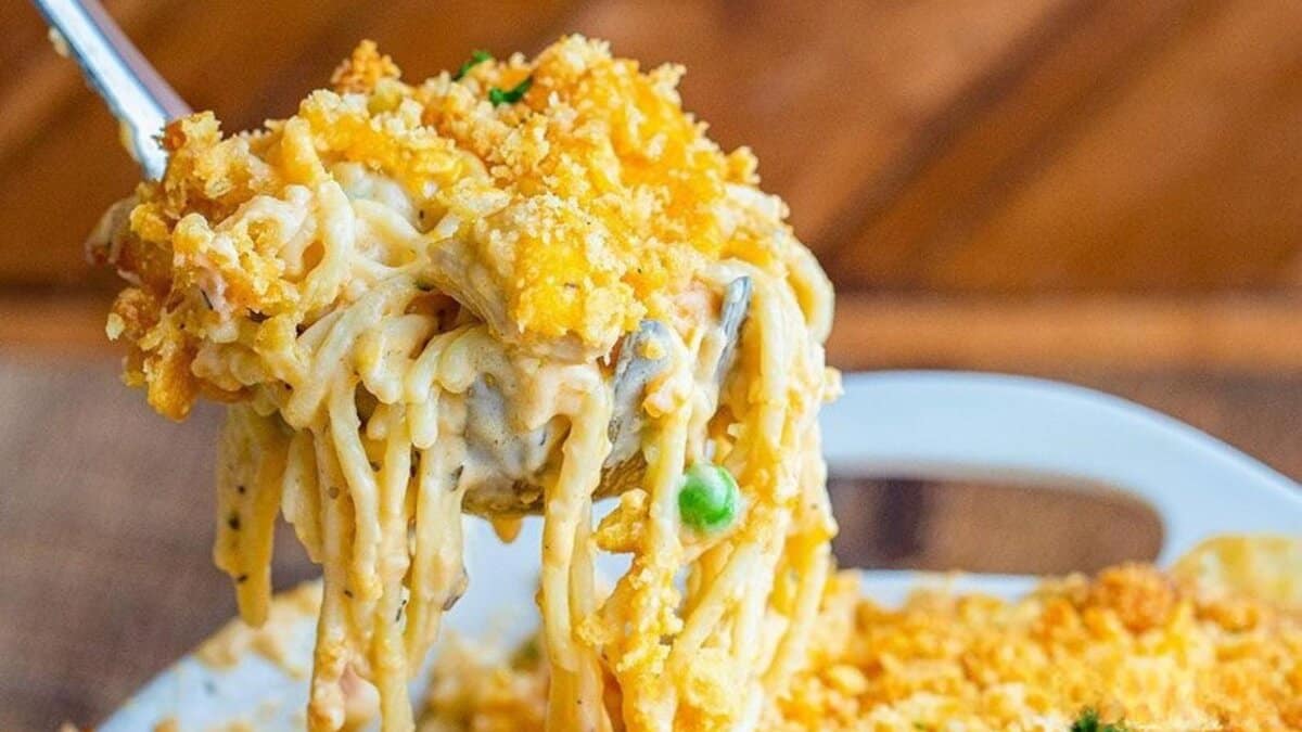 This casserole mixes turkey with pasta in a creamy sauce and bakes it with a crisp topping that browns in the oven. It uses multiple leftover components in one dish and turns them into a complete meal. The sauce thickens during baking and coats the pasta smoothly. It’s a strong pick for feeding a group without much effort.