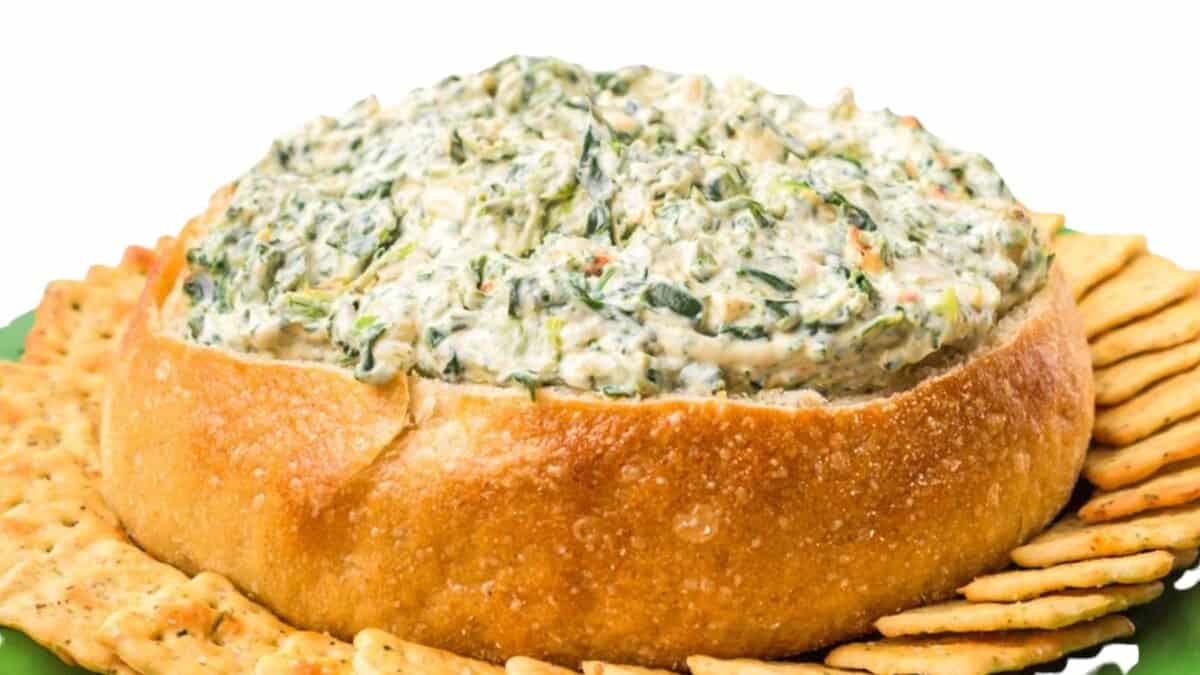 A bread bowl filled with creamy spinach dip always draws a crowd because it feels generous and shareable. The creamy texture, bits of spinach, and crunchy bread torn from the sides create that mix of flavors and textures people keep going back for. It is the kind of appetizer that keeps guests hovering near the table.