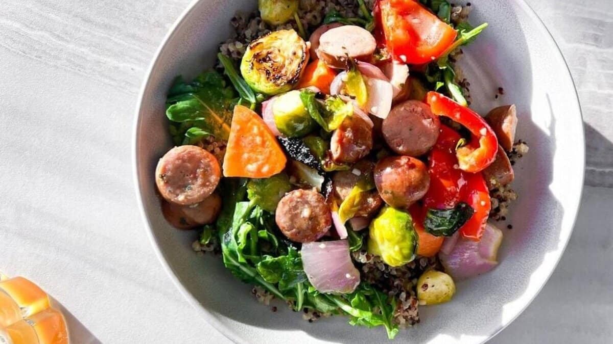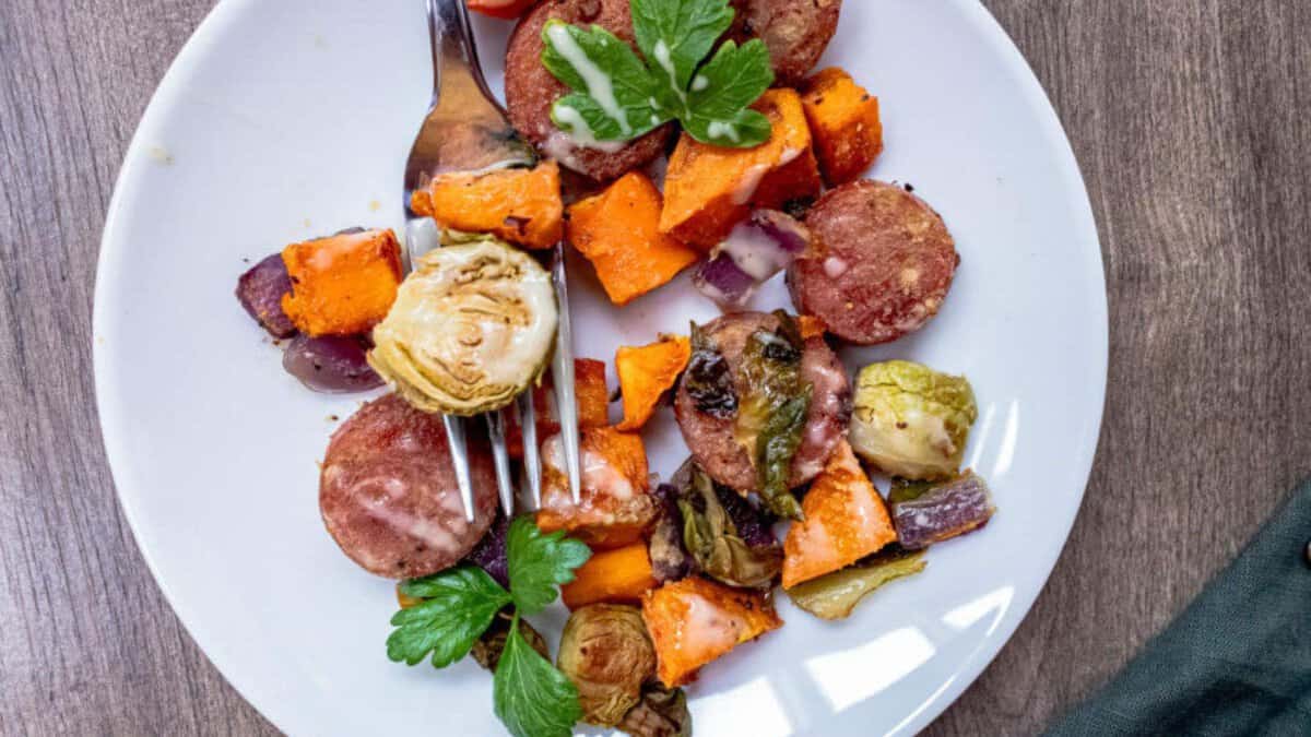 Chicken sausage brings a savory, slightly spiced backbone that holds its own against sweeter fall vegetables. The vegetables soften and caramelize, picking up richness from the sausage while keeping their own distinct flavors. Each bite feels balanced, with sweetness, salt, and a bit of earthiness working together instead of competing.