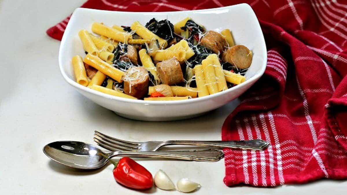 Ziti Pasta with Italian Sausages, Swiss Chard and Peppers