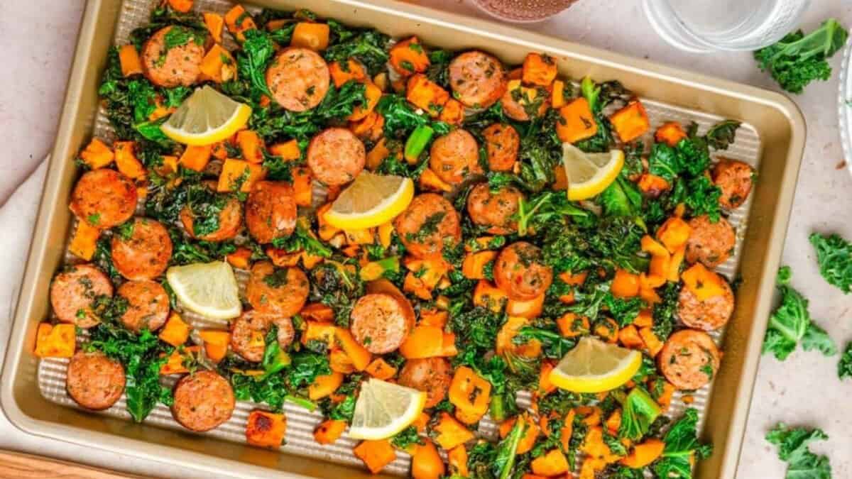 Chicken sausage provides a savory backbone that ties together vegetables with different textures and flavors. As everything roasts, the vegetables pick up seasoning from the sausage, making each bite feel intentional rather than thrown together.