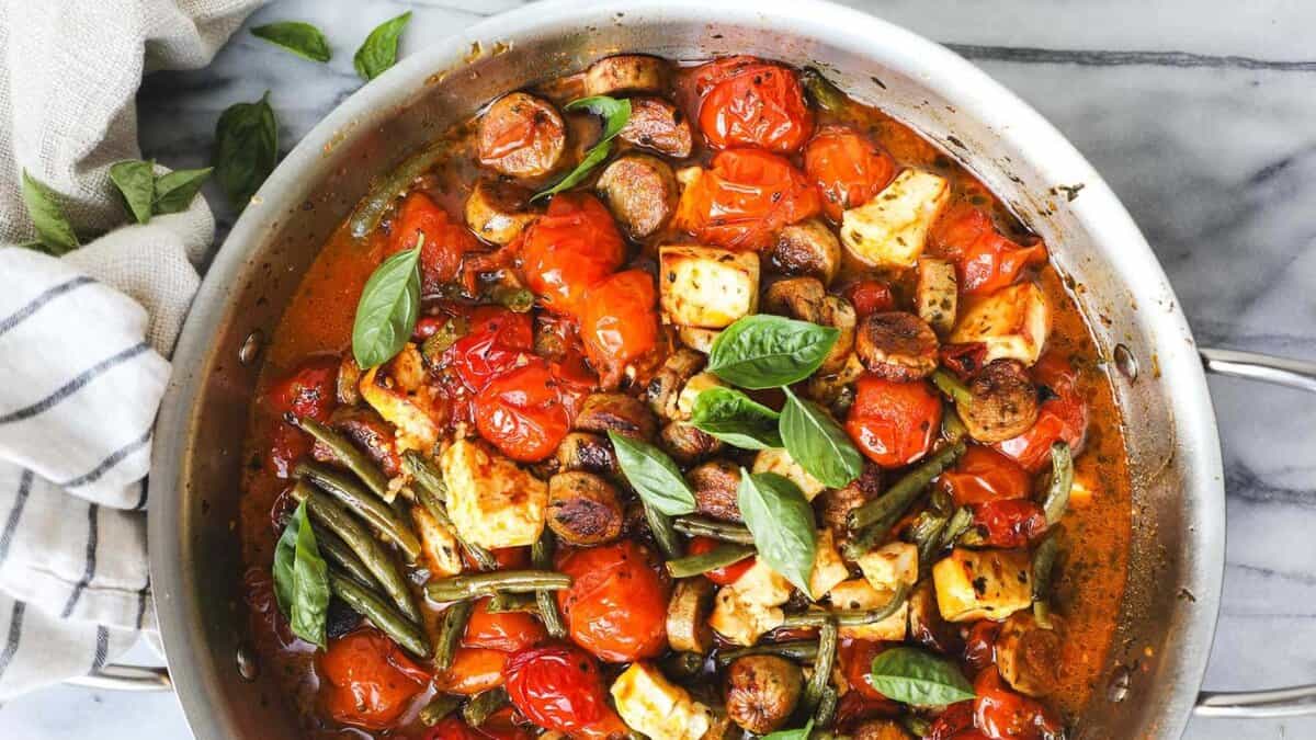Tomatoes collapse into a concentrated sauce while feta turns creamy and tangy. Chicken sausage adds richness and keeps the dish grounded, making the pasta feel complete rather than sauce-driven.