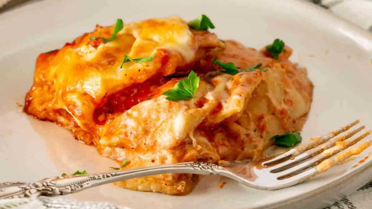 Pasta rolls bake upright so the filling stays tucked inside each piece. The cheese melts through the center while the sauce thickens around the edges. They hold their shape when served instead of falling apart.