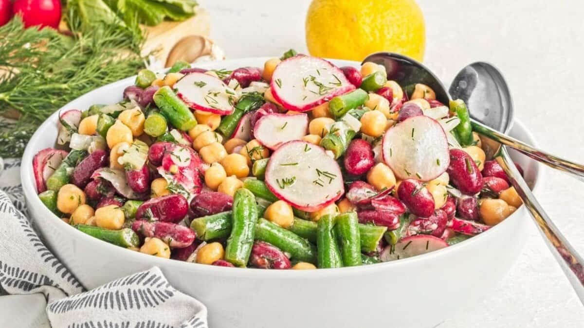 This chilled bean salad keeps things simple with a tangy vinaigrette and a mix of green beans, kidney beans and garbanzo beans. It sits well in the fridge, travels easily and breaks up all the heavy dishes on the table.