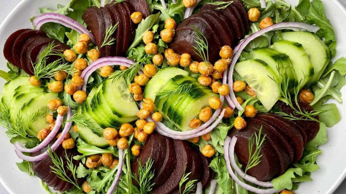 This salad pairs roasted or steamed beets with hearty chickpeas for a protein-packed meal that feels both fresh and filling. The chickpeas add a nutty, creamy texture that balances the beets’ deep flavor, and the dish is finished with herbs and a simple dressing. It works as a side, but it’s substantial enough to double as a main course for a light lunch.