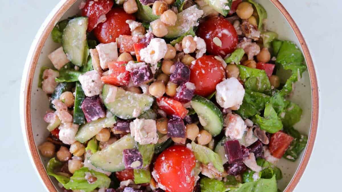 This salad layers sliced cucumbers, roasted beets, and arugula with toasted chickpeas for crunch. A basil balsamic vinaigrette ties the ingredients together, making it both refreshing and hearty. It’s easy to prepare ahead of time and holds up well in the fridge, making it a good option for meal prep or entertaining.