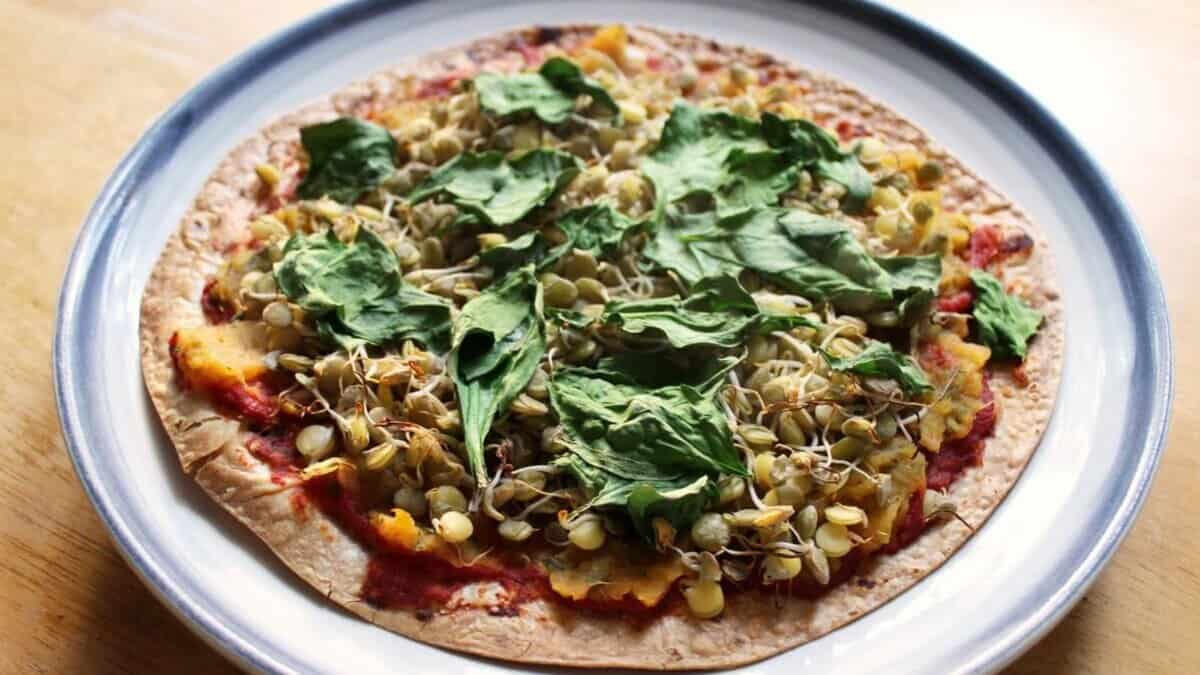 A tortilla or flatbread base is topped with a seasoned squash spread, spinach and cooked lentils. The pizza bakes quickly and comes out crisp with a soft interior. It is easy to portion and works well as a personal meal.