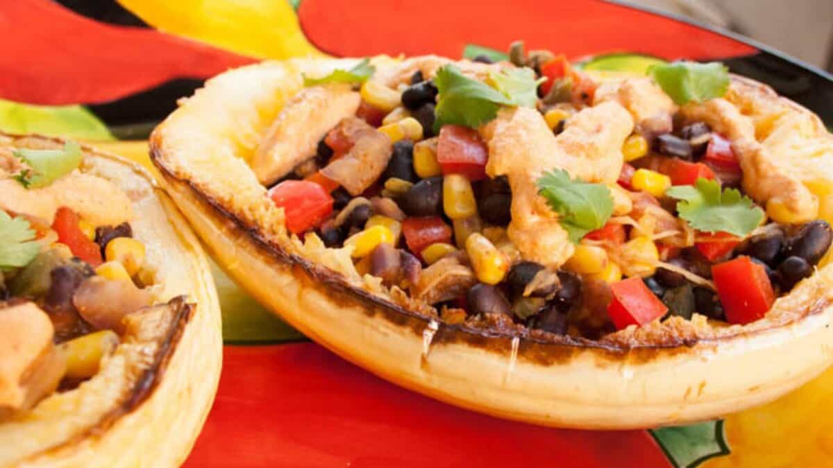 Spaghetti squash strands mix with beans, corn and peppers under a chipotle style dressing. The squash absorbs flavor while keeping its shape. Everything cooks quickly and combines easily in a single bowl or pan.