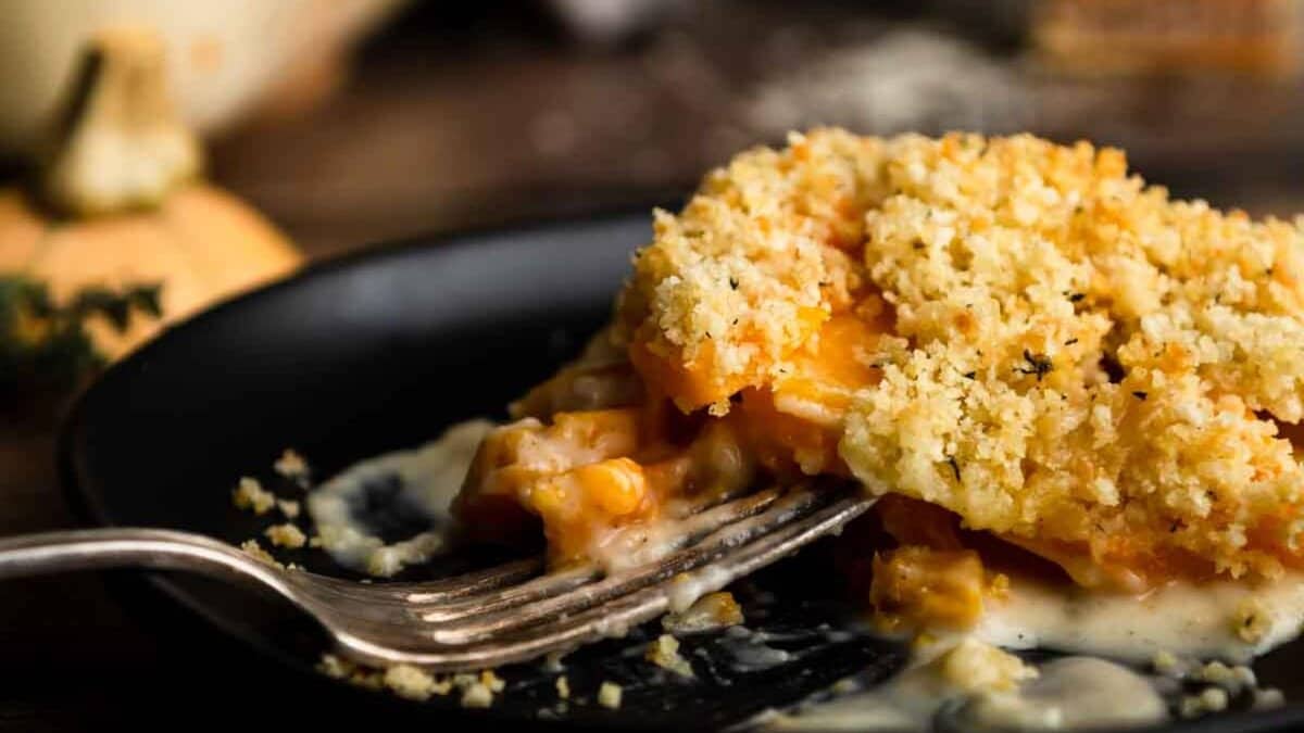 Thin slices of butternut squash bake in a creamy cheese sauce topped with toasted breadcrumbs. The squash softens while the top browns and becomes crisp. The dish sets as it cools and scoops easily from the baking dish.