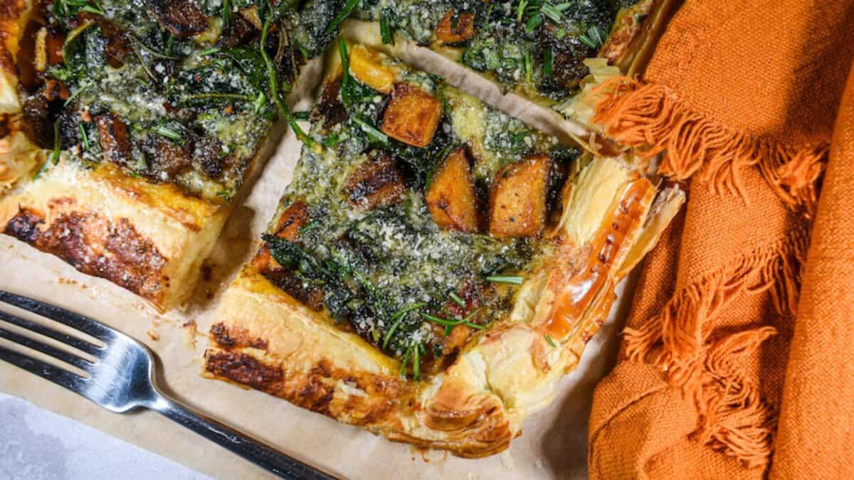 This tart layers roasted squash, caramelized onions, sautéed spinach, herbs and two cheeses on a flaky puff pastry crust. Each component cooks separately, then everything bakes together until the pastry rises and the filling sets. The finished tart slices cleanly and works as a main dish or hearty side.