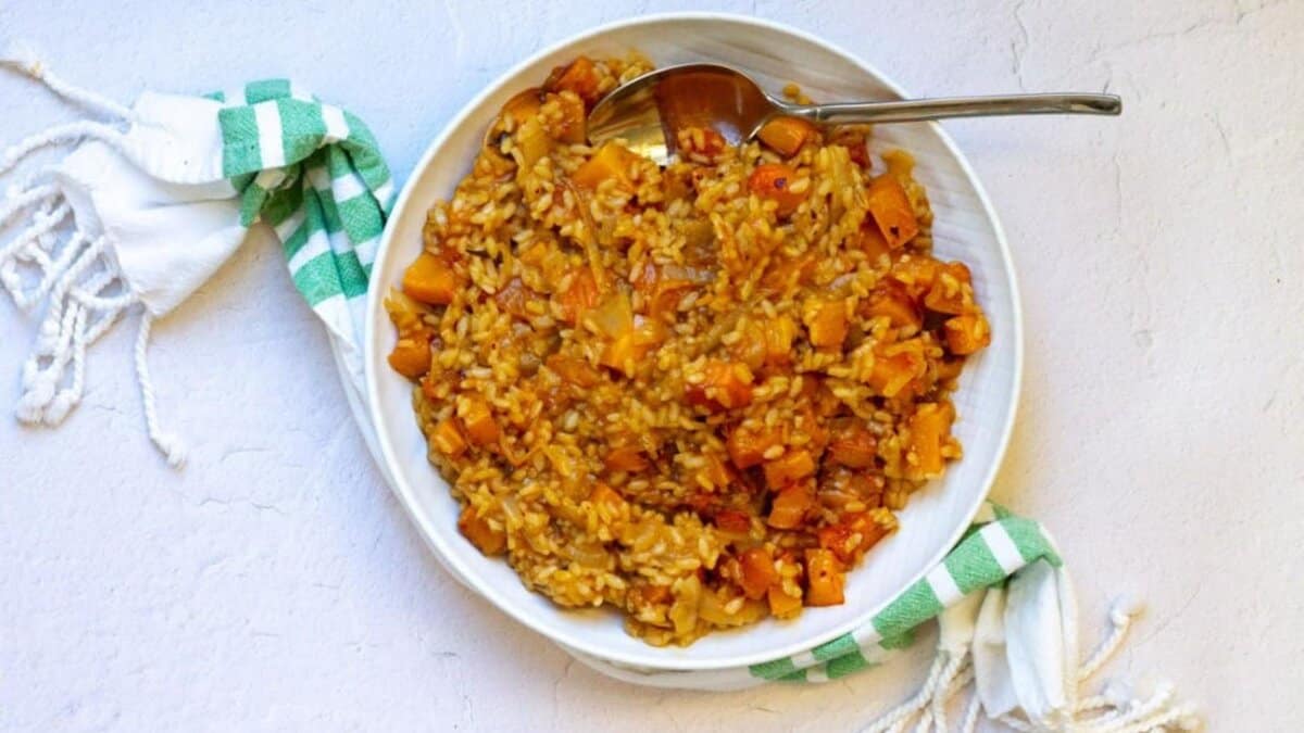 Roasted squash mixes into Arborio rice as it cooks, creating a creamy risotto without heavy additions. The rice absorbs the squash and broth slowly while stirring develops body and texture. It finishes with herbs and seasoning for a rich, smooth dish.